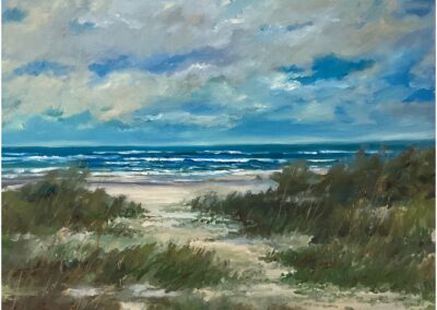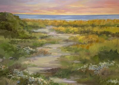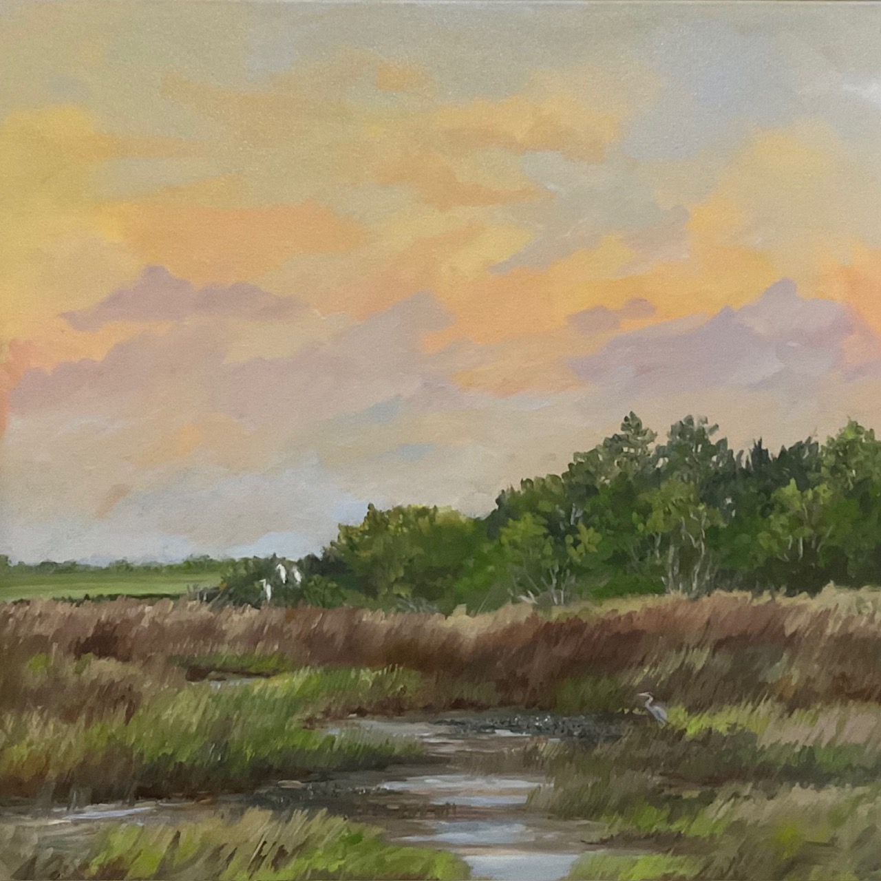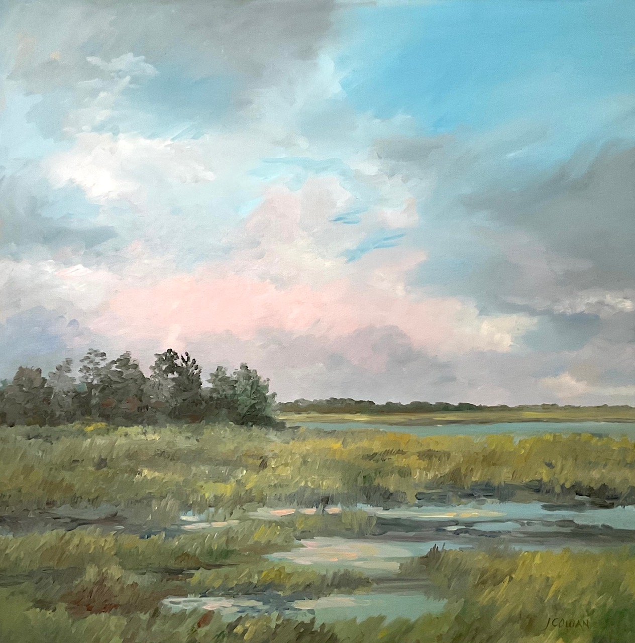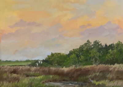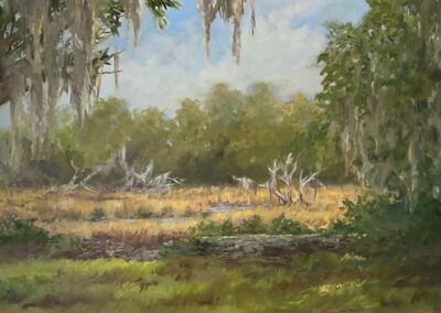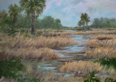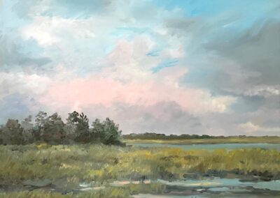 Johnnie has recently been focusing on painting nature’s open spaces, particularly the marsh and ocean. She say,” Although the marsh would seem easy to render, it is in fact as difficult to paint as the ocean.” She prepares for her paintings by both drawing and painting on location. To find the best lighting and composition, she has also photographed each location at different times of the day and in different seasons to use as references.